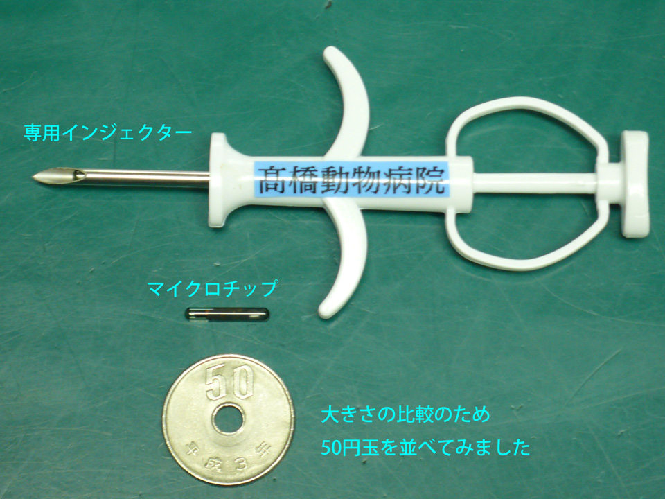 犬や猫の場合、注射器(専用インジェクター)で首から肩のあたりの背中の皮下に埋め込みます。埋め込みの処置は麻酔の必要はなく、通常の診療中の短時間で出来ますが、皮下注射と同じ位の痛みはありますので、当院では去勢や避妊手術などの麻酔をかけたとkに同時に埋め込むことをお勧めしています。